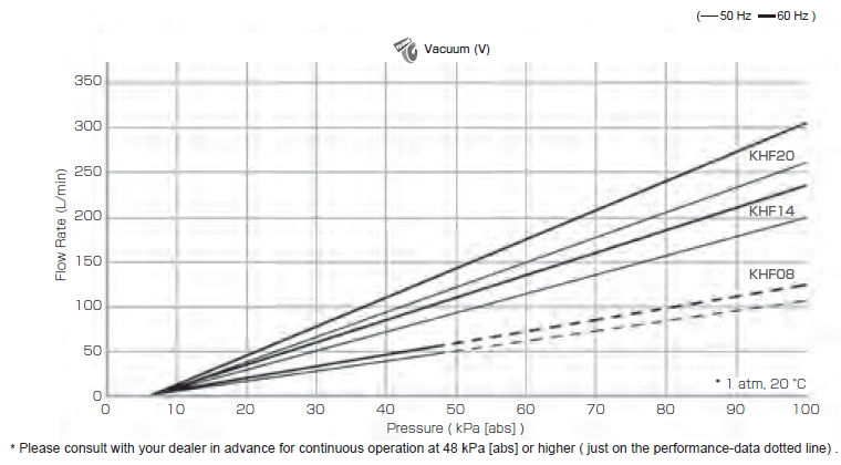 - Please consult your dealer regarding continuous operation at levels on the dotted lines in the performance data charts.